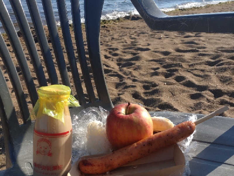 ベンチと椅子があったので、ベンチにタオルを敷いて砂時計をおいて足を伸ばして座る。ととのいスタート。