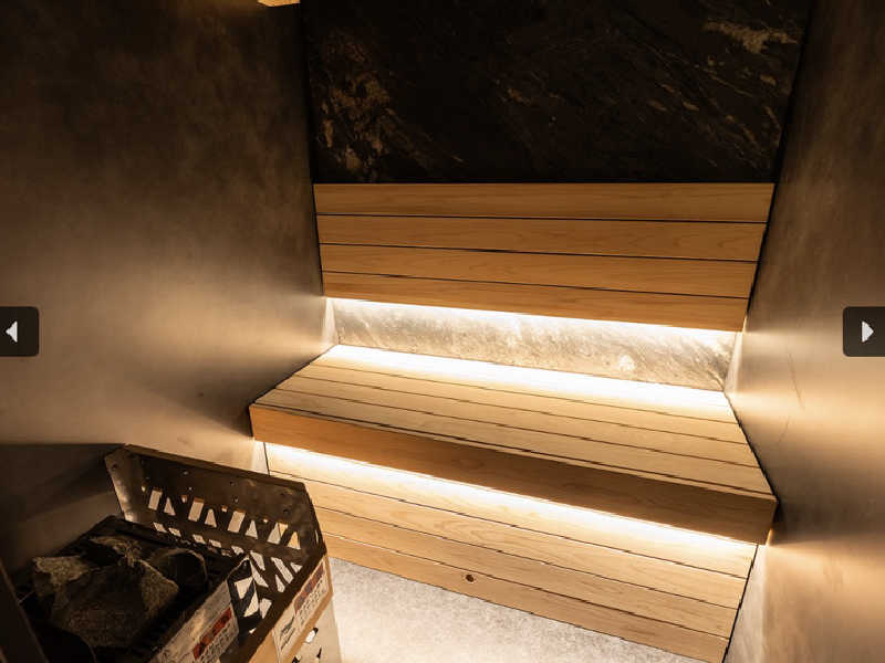 ☑️サウナ室:高温(100°C前後)で石壁?の2段式。