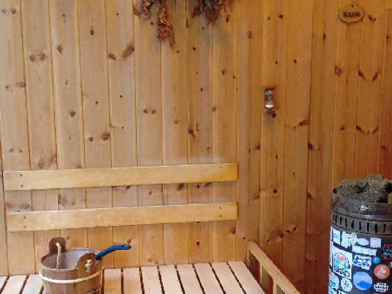 サウナ室。大きなストーブが2基とオートロウリュ用のストーブがあり、部屋のわりにかなり強力な温度を発揮してくれていました。