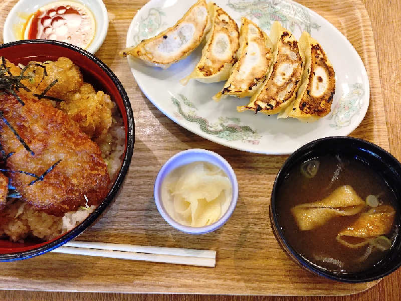 おやつの時間に到着して、昼飯がまだだったので、変則的に食事処で食事。ヤング丼と餃子を決めました。