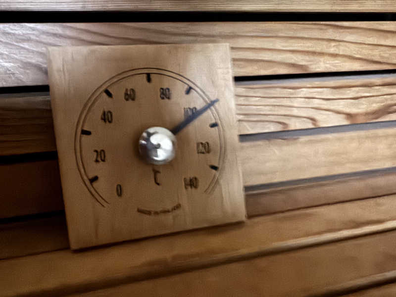 今日は急ぎ足で3セット。足元付近にある温度計は80℃くらいだったので2段目で90〜95℃位かな。セルフロウリュでいい感じでした。水温は体感15℃程度、冷たいなと感じるくらいでした。