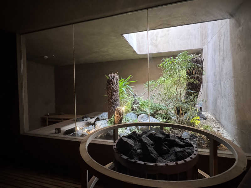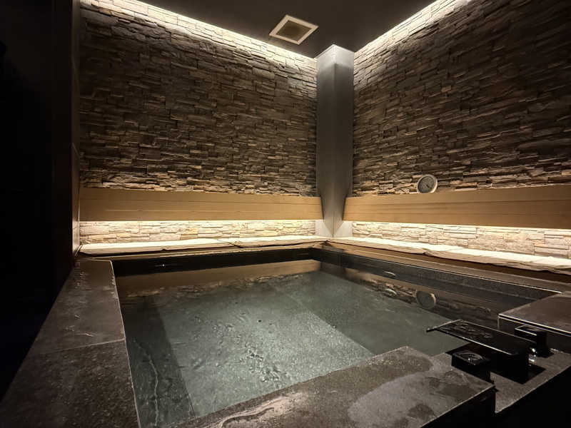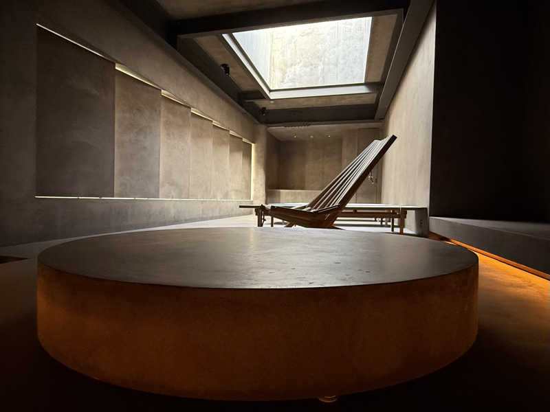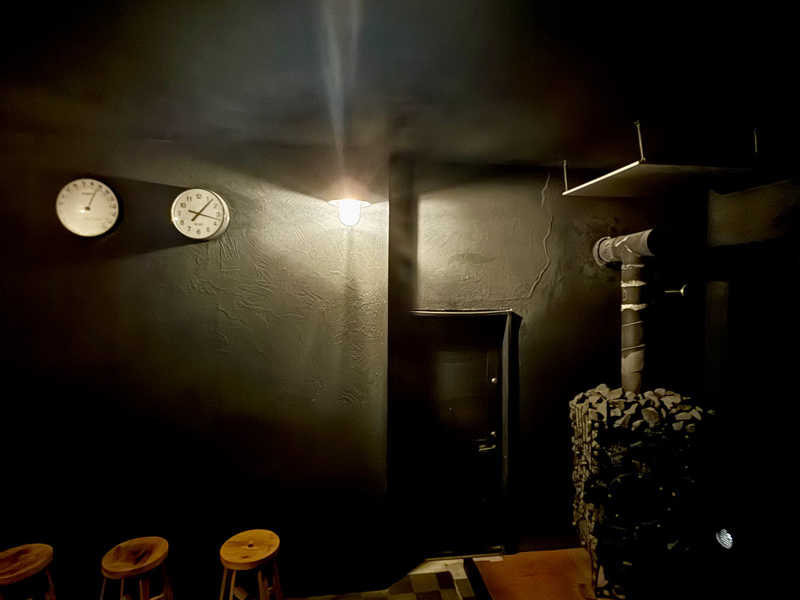 なかなかオシャレで暗いサウナです。サ室の暗さは10段階で8位の暗さです。温度はそこまで高く無くセルフロウリュしても心地よい暑さが続くのでいい感じでした。