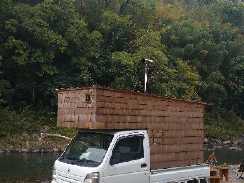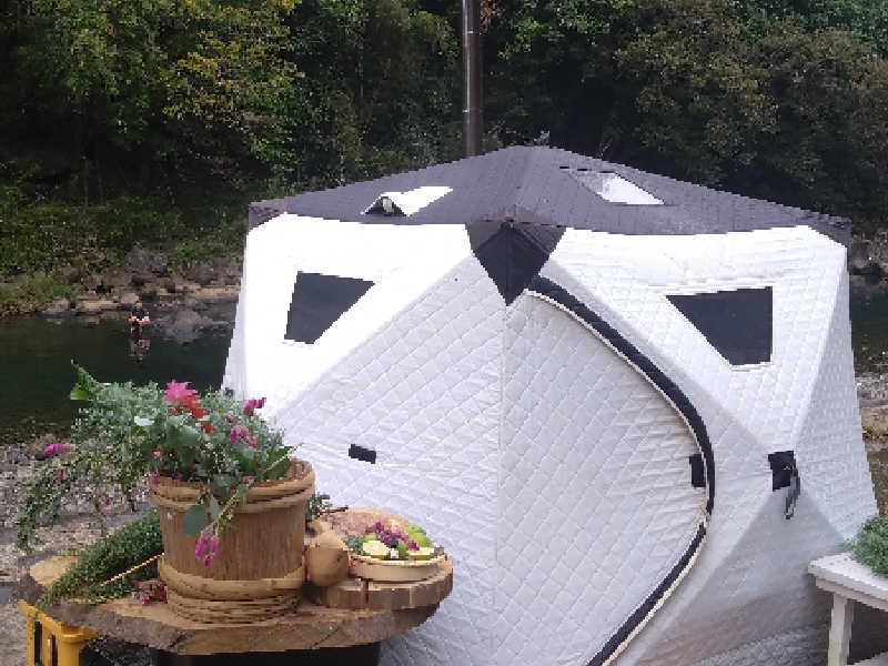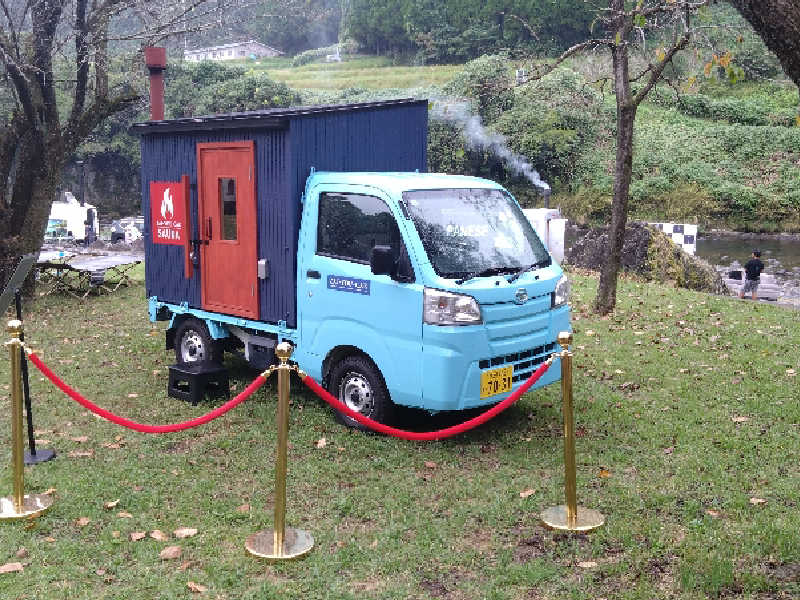 初めに移動式シネマサウナバスJOURNEY。ホーリーバジル・クスノハ・ビワ・マツのロウリュで蒸され、奥岳川へダイブ。宇宙旅行のシアターでととのいました。