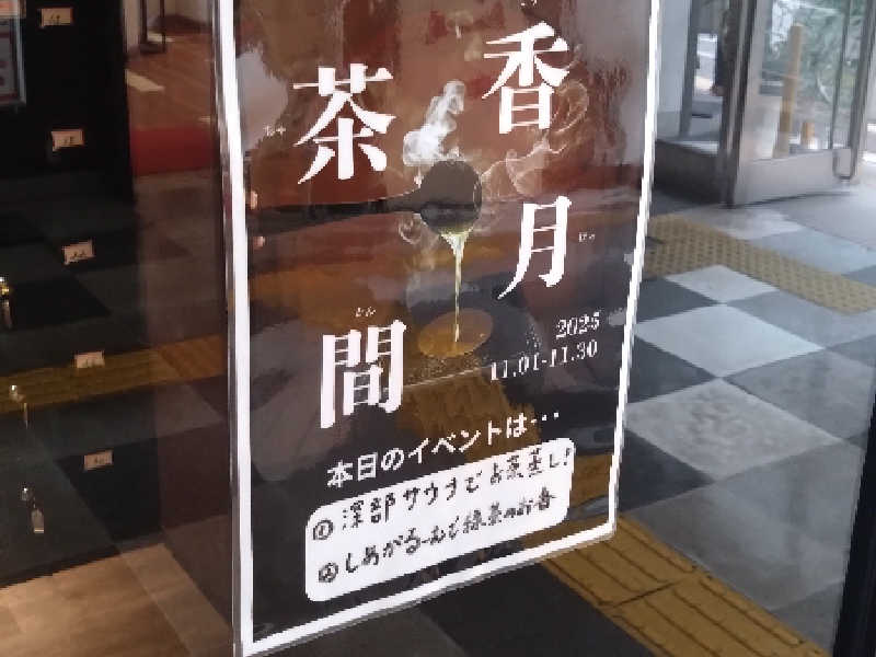 サウナヨーガン福岡天神のレディースタイムに妻を送り出し、こちらへと来蒸。本日は深部でほうじ茶蒸し。サ室ドアには緑茶蒸し。末端は漢方ブレンド。