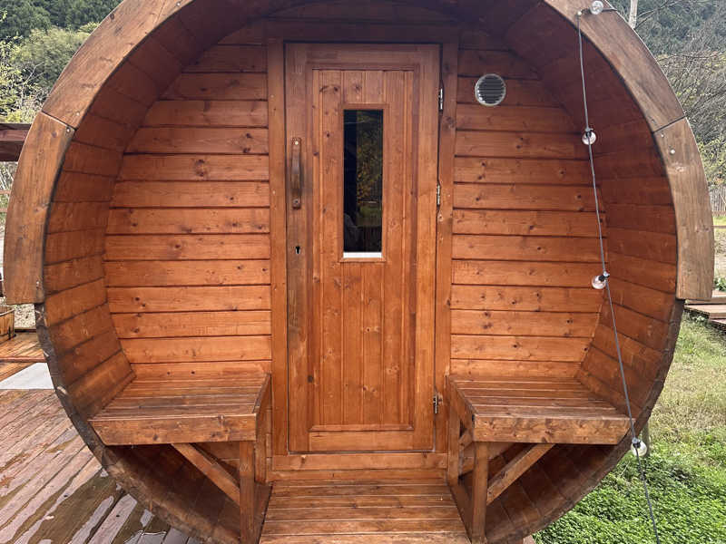 バレルサウナは100℃(ストーブが近いのでアツい)