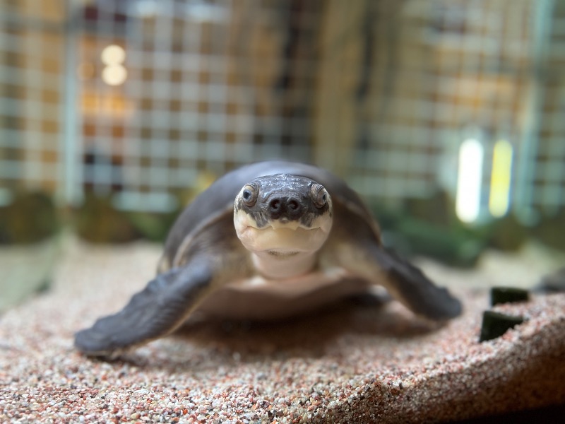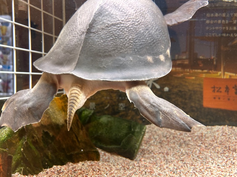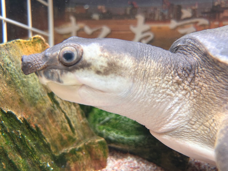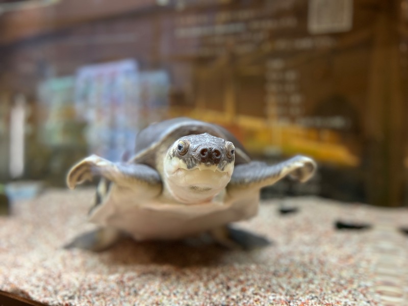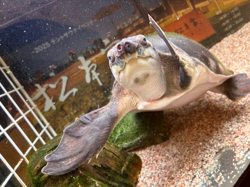 入口で出迎えてくれるのは、かわいすぎるスッポンモドキの「カメ吉」。会うたび癒される…。