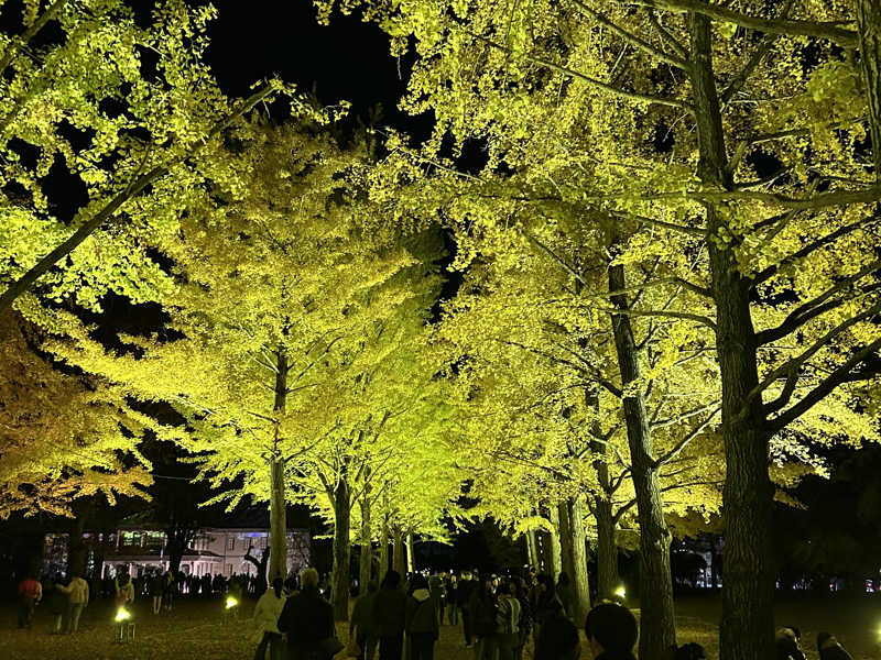 やまの湯でたらすっかり日が暮れており、イチョウ並木が素敵なナイトミュージアムへ