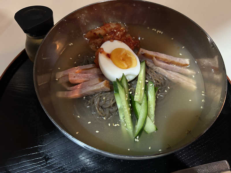 有名なしきじでサ初め🧖♀️ 薬草サウナの香りが好みで3回入りました。 水風呂、体が痛くならないからまったり冷やすことができました。 水風呂近くのベンチに座ったら溢れてきた水が流れて来て、それもよかったです。 冷麺さっぱりして美味しくて、すぐ食べ終わってしまった🥹