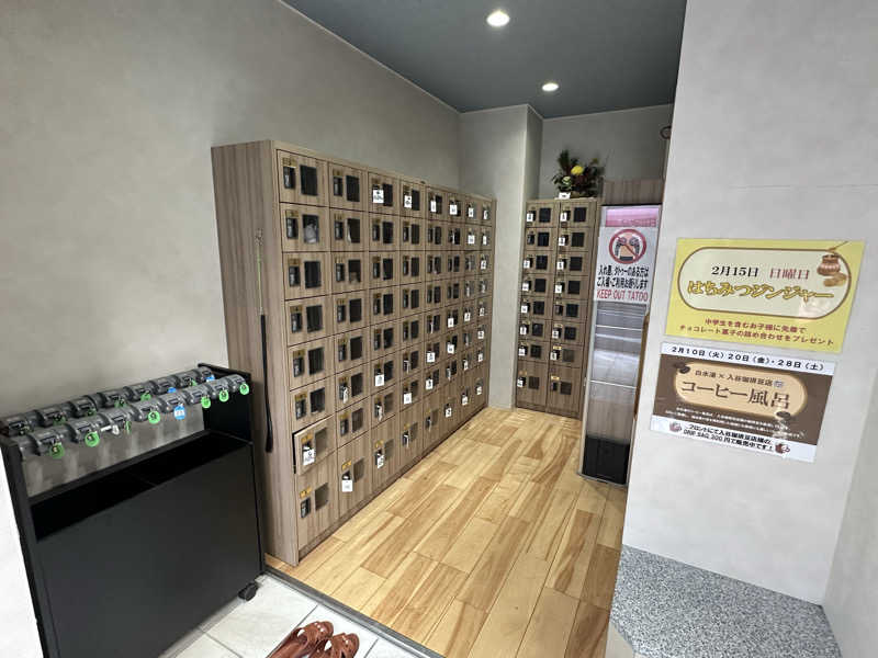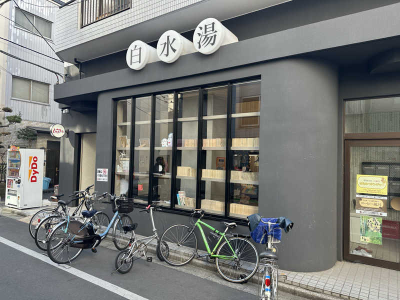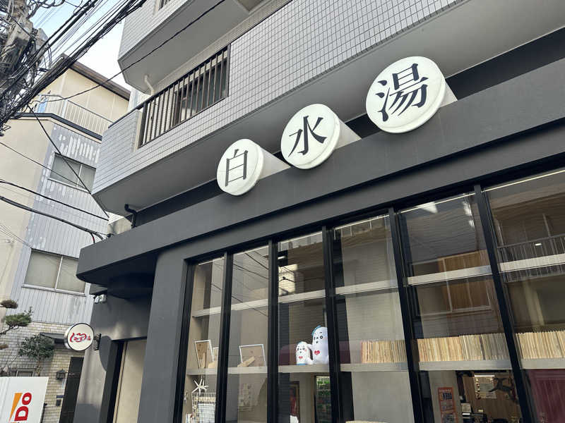 あまり行かない台東区内の銭湯巡りをすることで行くことにした。SNSやサウナ情報をよく見かける「白水湯」なので初訪問!外観ではおしゃれ!しかも内部に丸見え!早速大浴場に入ったら…めちゃキレイ!壁に【サ】があり、奥ではサウナ室と緑色の水風呂!外気浴ルームにも。