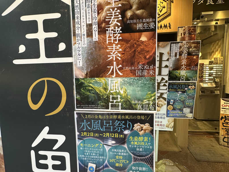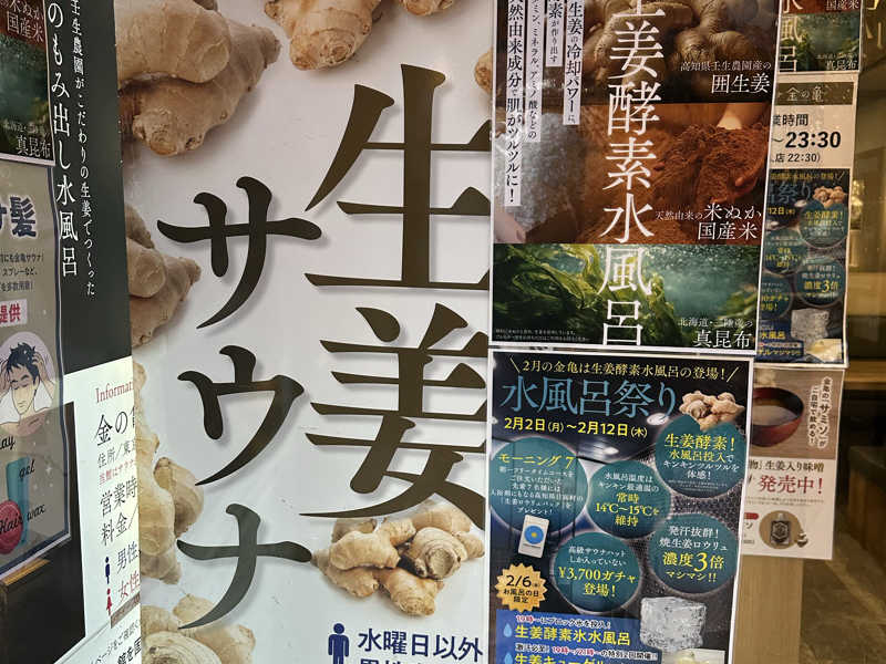 今日も赤坂の「生姜サウナ 金の亀」に訪問☆120分チケットは2月15日に有効期限なので金の亀は1週間に1回は行かなくちゃな…。寒い日に生姜だらけの施設にハマっちゃうなぁ。今回は酵素入り生姜水風呂!他にもいつもの通りの生姜ロウリュサウナ、生姜味噌汁、生姜スープ、生姜タブレット、生姜アロマ、生姜シャンプー&ボディソープ…。完全に生姜サウナやん!まだチケットがあるので、来週もまた行こ!