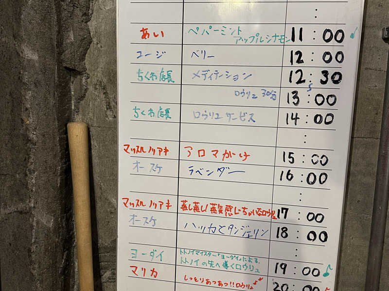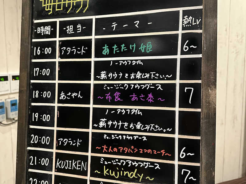 早速サウナに入ったらめちゃ熱い!20:00のアウフグースを終わった後、入ったので熱さはまだ残ってるため、いきなりアッチッチ🔥笑 2セットしてから21:00〜のkujikenさんのアウフグースタイム!ワクワク!入室前、kujikenさんから『熱いので無理にしないでね。』と優しい一言を言ってくれていい感じ★ 自分はいろんなところで熱いサウナを受け慣れてるので、kujikenさんの熱さLV7なら大丈夫かなと挑戦!笑 でも最後までに受けました🔥🔥とても最高‼️2時間に4セットで終了。薪サウナはとてもいい!また行きたくなるー‼️