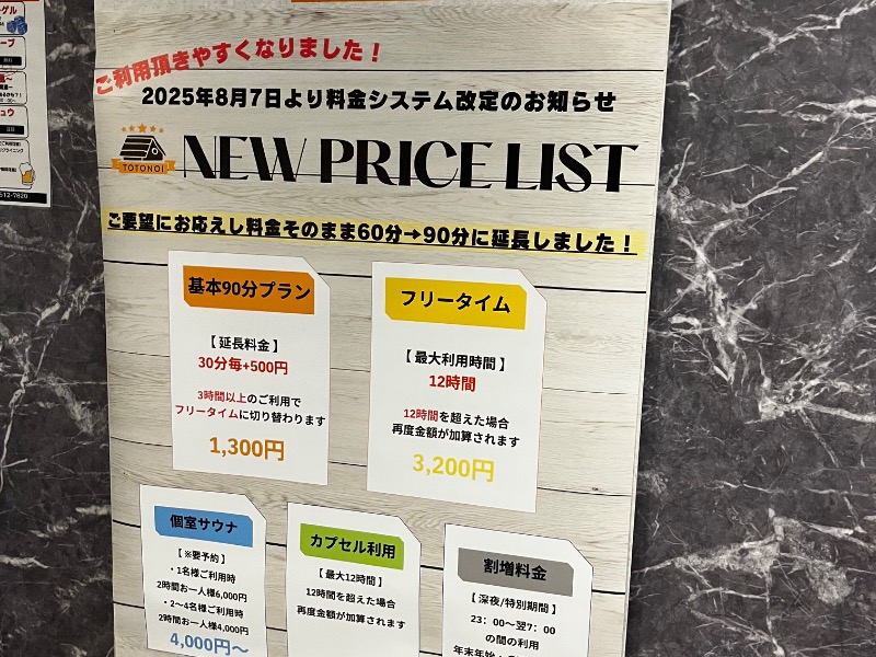 まぁ書くことは特段ないですが、料金設定が変わって、90分1,300円の30分ごと500円とな。使いやすいんじゃないでしょうか、休憩する気がないのなら。