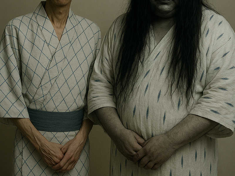 浴衣姿のタッチーは変なマスクをつけて怪談を始める