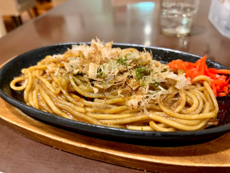 焼きそば、これよこれ。この鉄板で出されてパリパリになったやつが美味しいのよ🤤✨