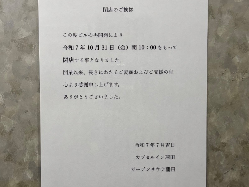 一言:初めて来た時はセルフロウリュサウナもまだ無く、3時間1,200円だったかな。明後日で閉店ということもあり、ここまで混んでいるのは初めてでした。半年に1回ペースの利用でしたが、お世話になりました。
