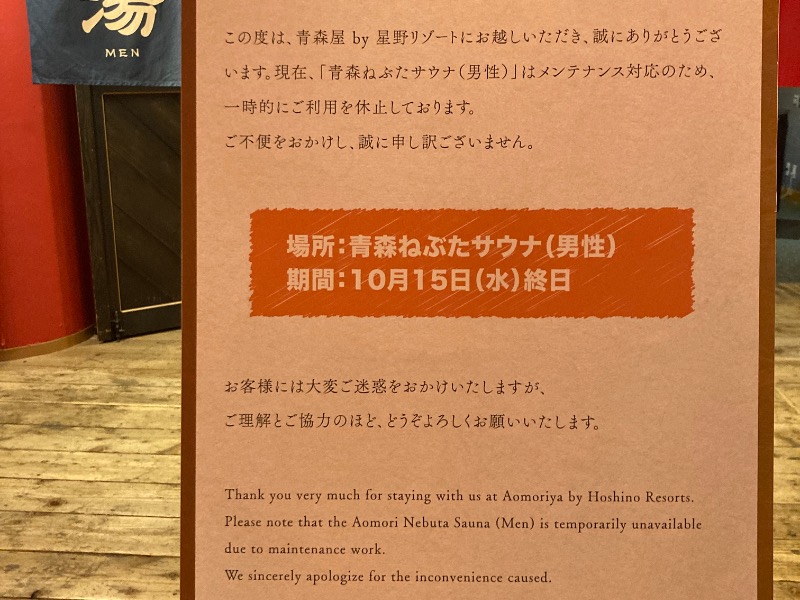 昨日到着した時、男性サウナは故障中で入れません!って言われて、