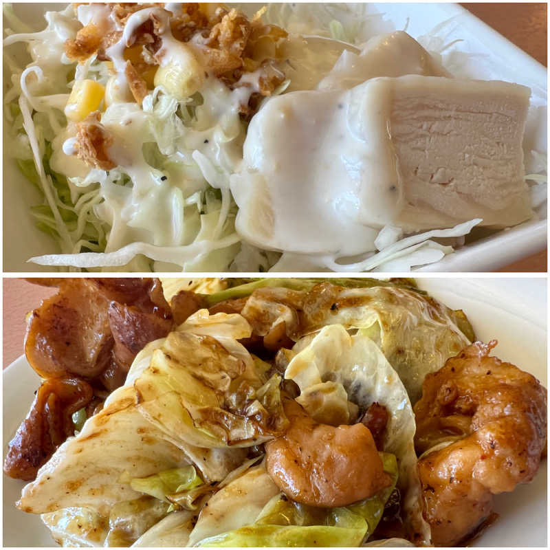 サ飯は、ほぐしチキンキャベツサラダ (ミニ) 450円。ホルモン焼き 650円。