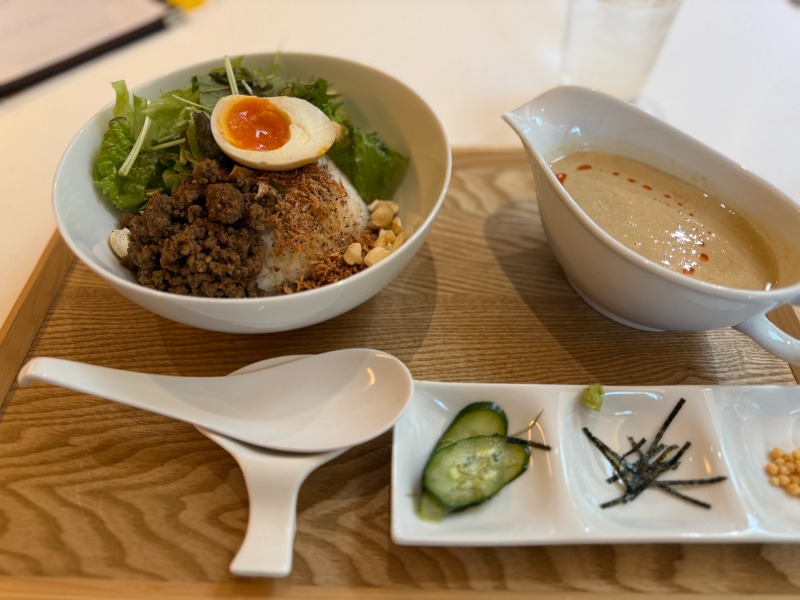 ラム担々「麺」ではなくお米でした。だしをかけてすっと食べられて、サウナ後にぴったり。