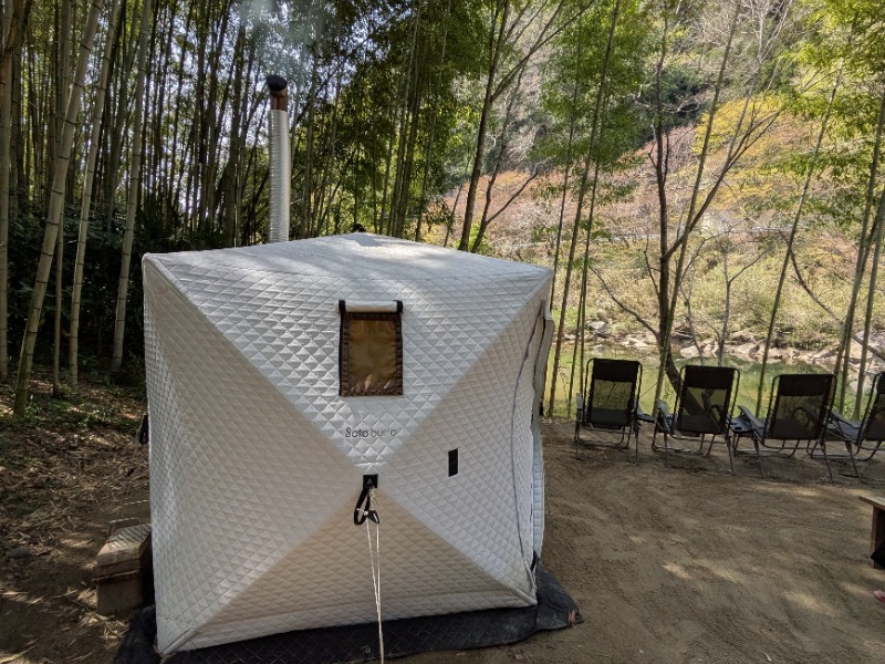 テントサウナ内は90℃ 薪のスチームサウナ カラカラにならず サウナ内は快適🎵