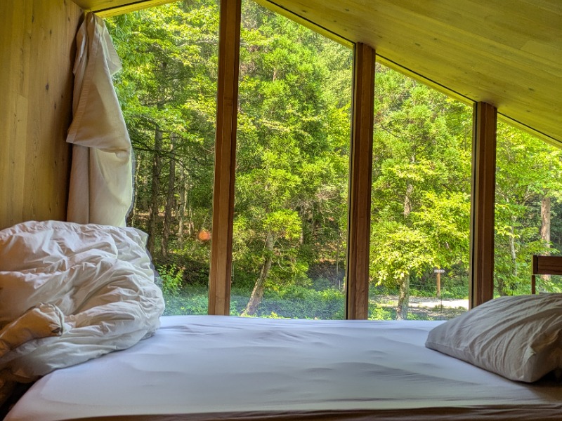 室内はこじんまりしているが 無駄のないレイアウト ベッド横の大きな窓が緑をいっぱい映し出し 最高 TVもなく デジタルデドックスも良い感じ