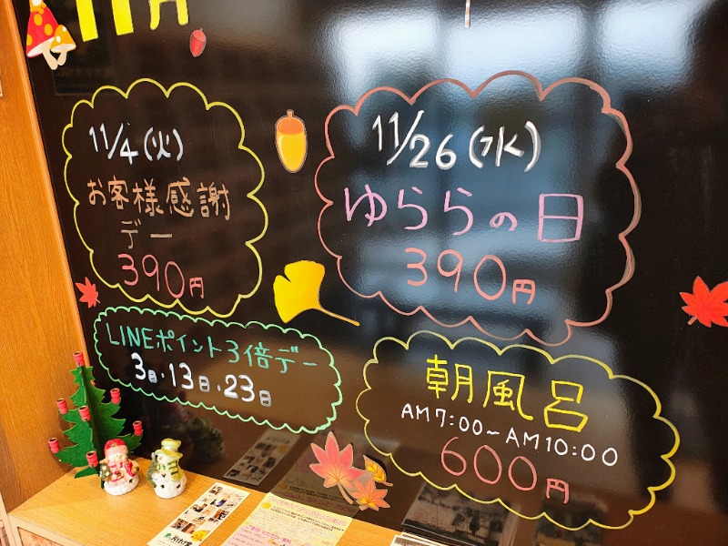 一言:昨日サウナリニューアルオープンで本日ゆららの日390円✨