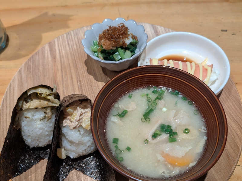 あサ飯は一汁三鉢でおにぎり(ザーサイ高菜マヨ、ツナたく)、豚汁、小松菜とちりめんさんしょおろしのせ、ハムエッグ。最高ウマイ。
