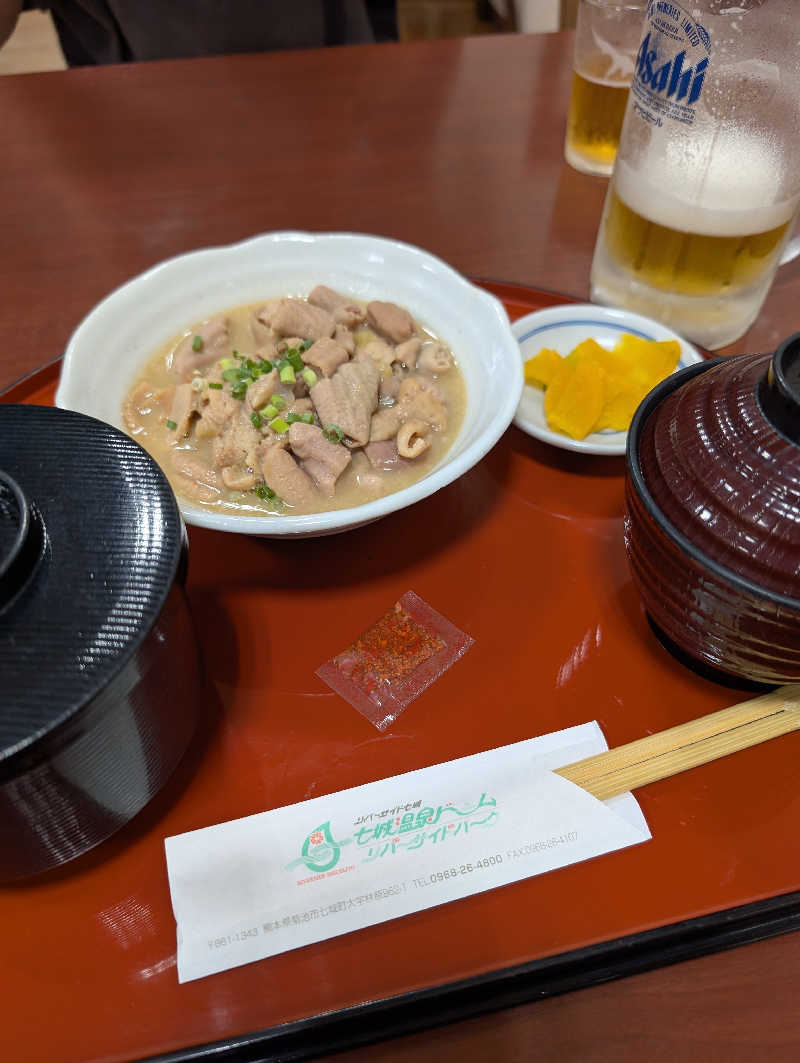 レストランでホルモン煮込み定食と生ビールをいただいて