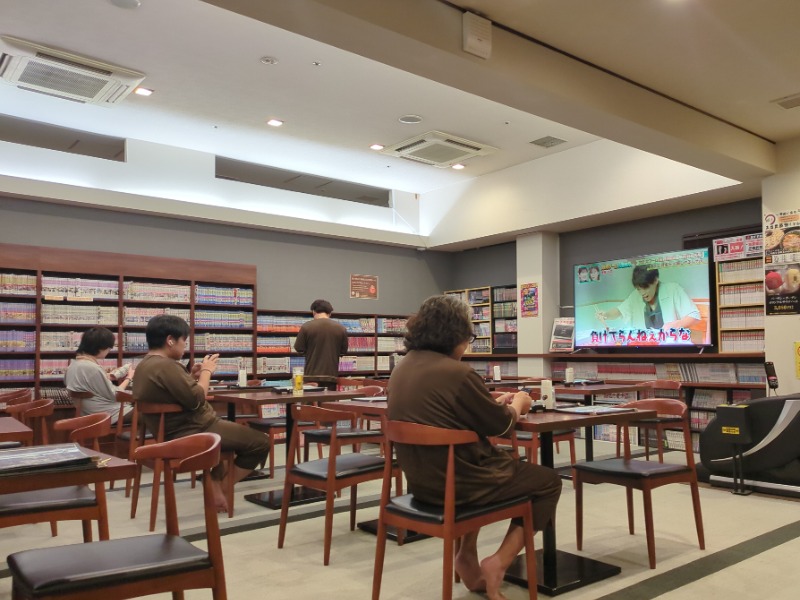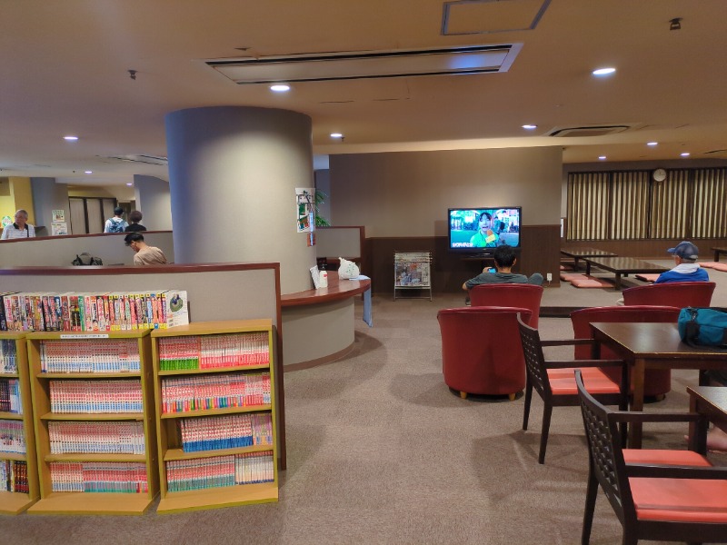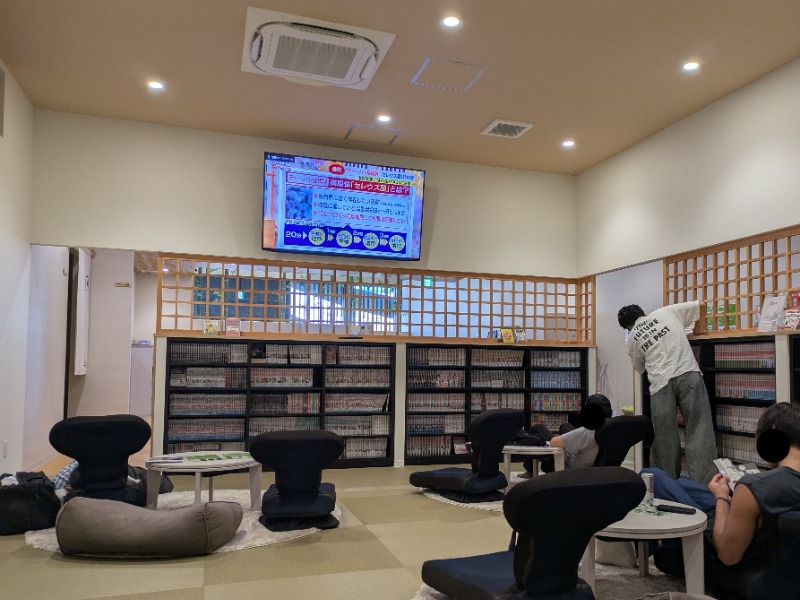 水風呂は深めで冷たすぎずゆっくりできる。休憩はさっきの木製ベンチのひな壇で。頭を上げると天井の窓が開いていて、そこから風が時々降りてきます。お風呂は白湯、バブル🫧、寝湯、座湯、打たせ湯等と数が豊富💕。湯で遊ぶ場所ってことで湯遊邸ですね。そういえばお風呂上りに更にもう一段階段を上がると、漫画が並ぶスペースがありました😄