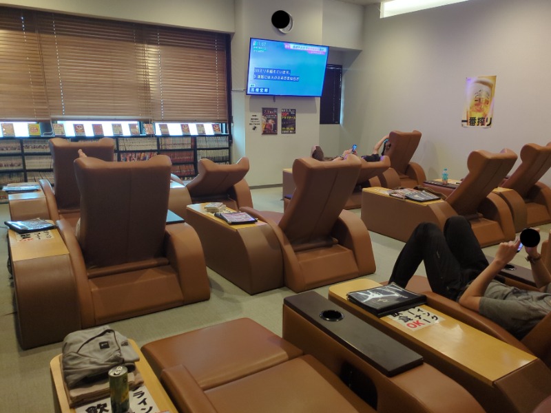 水風呂は浅めだけど広くて冷たい。ここの浴槽はこの水風呂と主湯の2つだけ。外気浴はできないけど、風呂場のプラ椅子かこのロッカールームの長椅子で休憩が可能です。ロッカールームは広くて清潔✨。パウダースペース奥には漫画の棚と、リクライニングシートが数台並び、館内着で何名かの先客さんがリラックスしています。ここで簡単な食事もとれるらしい。いいサウナがこんなところにありました🎵🌺(6日のサ活)。