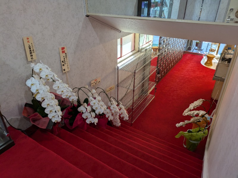 今日は土日料金で8時間2300円コースのみ。赤じゅうたんに胡蝶蘭が並べてある階段を昇って大きな暖簾をくぐるとそこが脱衣所、奥にロッカールーム。風呂場は暖簾の横と迷いようのないシンプルな造りです🎵。風呂場の中もシンプル。浴槽はあつ湯と水風呂のみ。壁沿いに並ぶカランは隣席との距離が近い。隣人に気を遣いながら身体を洗い、あつ湯で少し身体を温めた後、先ずはドライサウナへ。