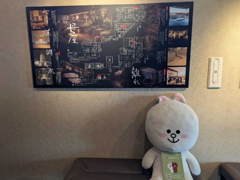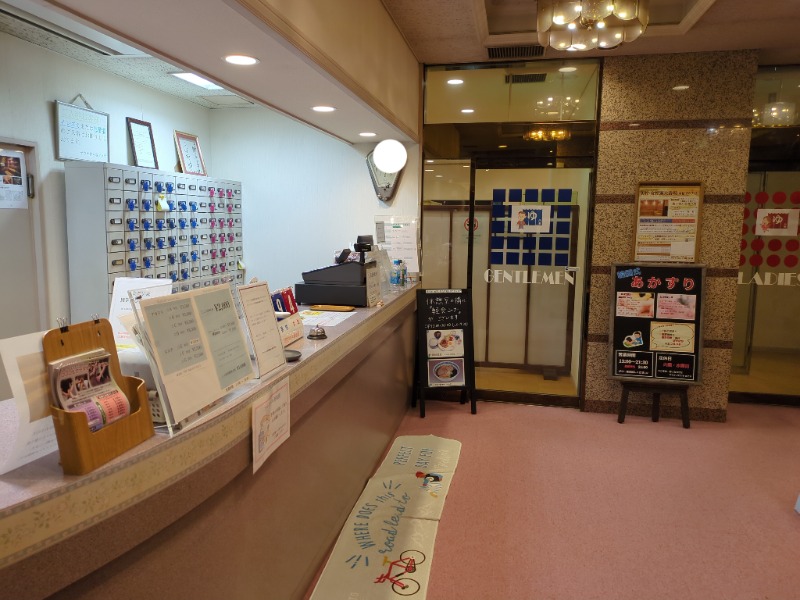玄関両脇に大きなターボババァ😺がお出迎え。靴を脱いで受付でサウナ利用者用ロッカーキーを受け取り、中階段を昇って男湯の暖簾をくぐります。
