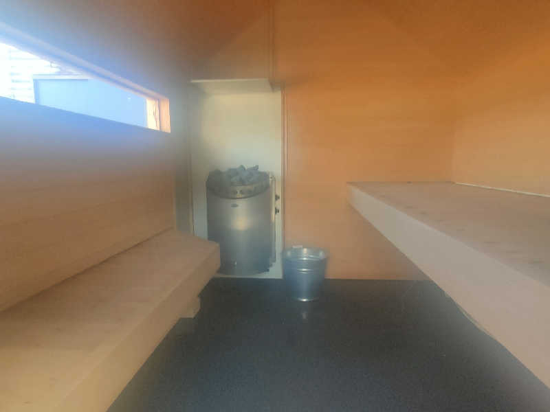 暗い室内にリクライニングタイプの座面が2席分、ストーン対流式85℃。セルフロウリュ可👍
