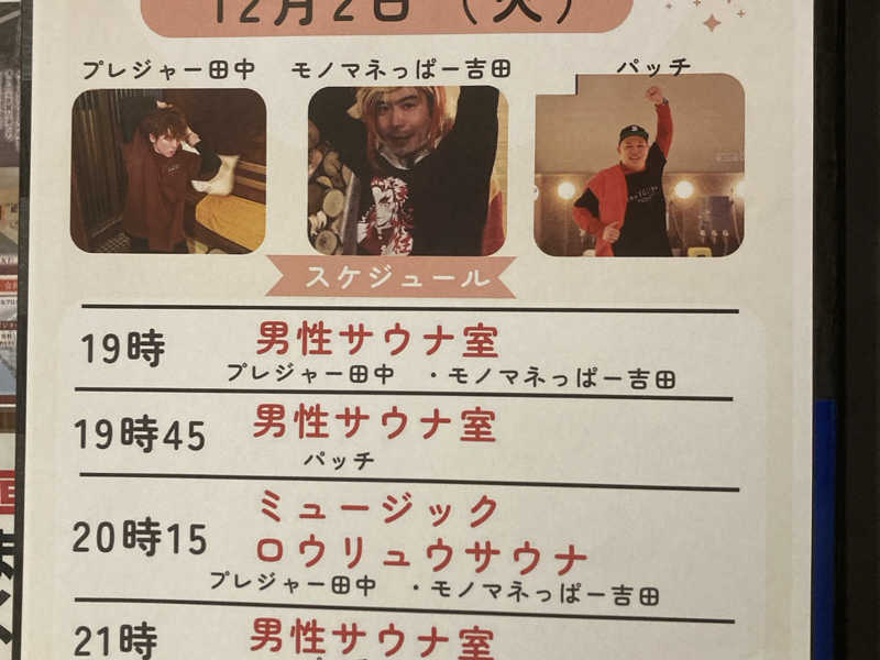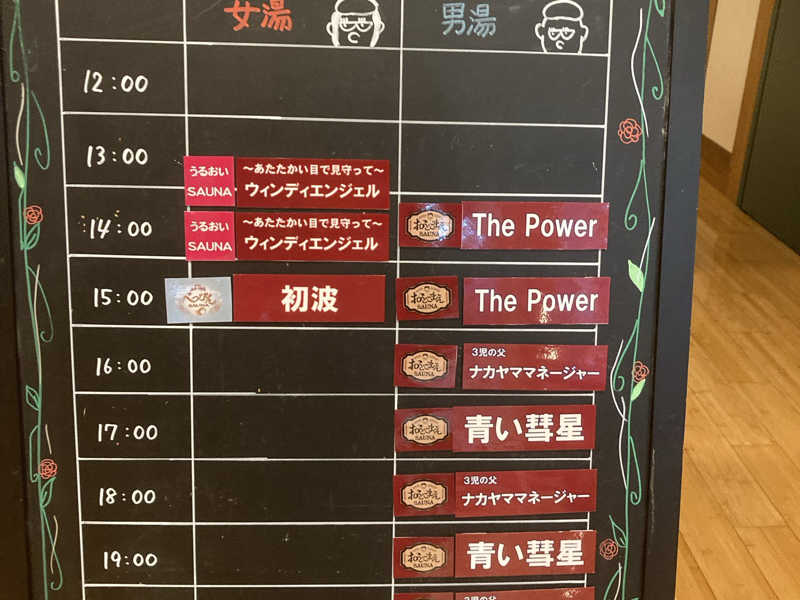 ゲリラロウリュイベント。4セット中運悪く一度も当たらなかったけど、サ室はずーっとアロマの香りがしてリラックスできました。ありがとうございます。