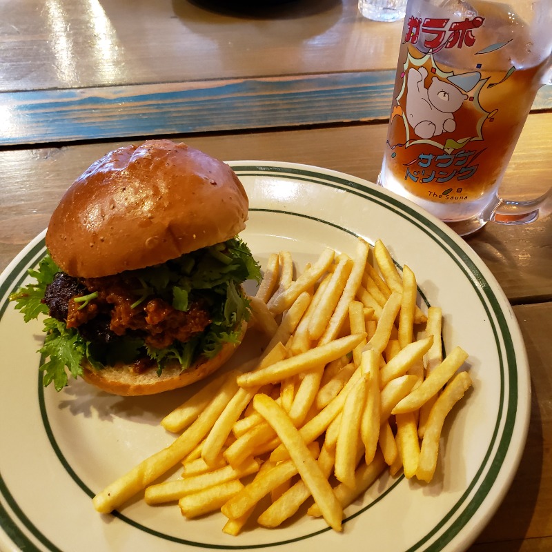 サウナ後はハンバーガーとガラポ!何食べてもうまいとしか言わないマシーンとなり夢中で食べました。本当においしかった。
