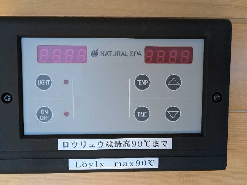 温度は110℃まで設定できるが、ロウリュをする際は90℃以下にしないとストーブが自動停止するという注意書きあり