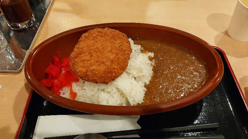 お腹ペコペコで3階のレストランへ移動。サウセンのサ飯は定食にする事が多いけど、今回は焼きうどんとカレーライスと鍋もあり、迷いに迷って薫製カレーライス🍛コロッケ乗せに決定。
