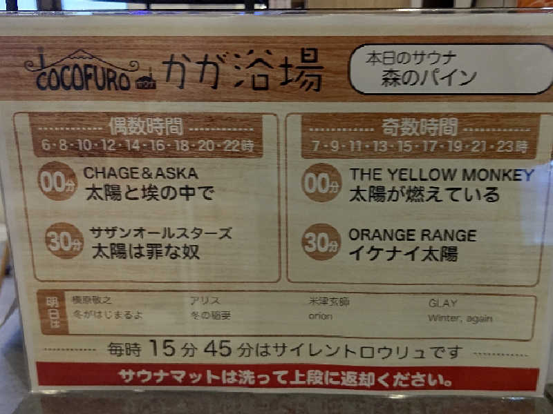 到着して券売機で券を買ってからフロント(番台)🛎️で券を提示してサウナバンド🧖♂️🏷️を貰い、そしてもちろん「東京銭湯スタンプラリー2025 ゆっぽくんといく‼️ #銭湯ホッピング2️⃣ ぽかぽかオールスターズ編🛅🪞🧼☕️🥛♨️」のスタンプラリー台帳1️⃣冊目の2️⃣個目(カランズ)にスタンプの押印を貰い任務を行ってから脱衣場で準備を行ってから浴室へまずはいつものサウナ🧖♂️前のルーティンを行ってからミュージックロウリュサウナ🎵🔥🧖♂️へ室内の温度は90℃で男性ヴォーカルの太陽ソングDAY🌞の1回目はいきなりイエモン(THE YELLOW MONKEY)の「太陽が燃えている🌞🔥」からスタートして10分、2回目はORANGE RANGEの「イケナイ太陽😎🌞」にノリノリ💃で8分、3回目はお目当てのチャケ&ヤスカじゃなくCHAGE and ASKAの「太陽と埃の中で🌞🥀」も心の中で大熱唱🎤🎸し壮大なナンバーにチャゲアスの横浜アリーナ🎤🎸のLIVEの観客側ではないチャゲアス側の熱さの体感を感じました❗️このパートはロウリュが終わっても曲が流れ続けアディショナルタイムを含めて11分、ラスト4回目はサザンオールスターズの「太陽は罪な奴🌞😎」は最後相応しくノリノリ💃で8分のサウナ🧖♂️は4回行ってから汗を出し蒸されたら掛け水で汗を流してから13.5℃のキンキンに冷えたエクストリーム水風呂🥶に1分4回浸かってから体を拭いて、休憩はととのいスペースまたは脱衣場内のととのいチェア🪑で約20分の内気浴または半外気浴を行って最後は湯船にしっかり温まって整いました❗️