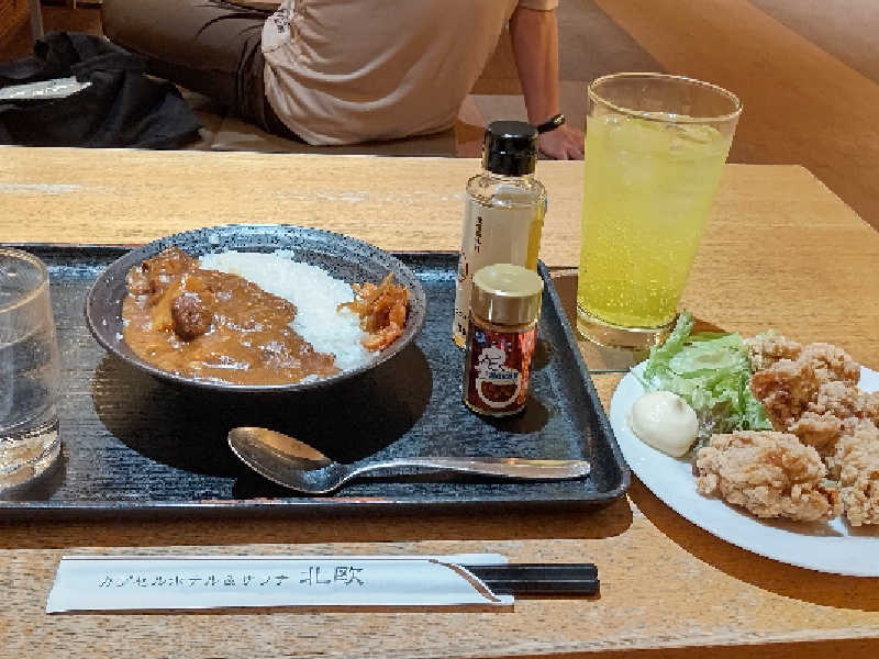 到着して、下駄箱に靴を入れてからフロント(受付)🛎️でチェックインをしてまずはカプセルルームNo.と同じロッカー🛅に荷物🧳を入れて、館内着にも着替えを行ってからカプセルルームで少し休んでから7階の浴室でいつものサウナ🧖♂️前のルーティンを行ってからサウナへ今回はメインの第1サウナ🧖♂️に室内の温度は110℃で1回目は慣らしの6分、ラスト2回目も6分、時間もありサウナ🧖♂️は2回行い汗を出し蒸されたら温かいシャワー🚿で汗を流してから14℃の水風呂を1分2回浸かってから休憩は北欧の名物外気浴スペースのととのいチェア🪑で5分2回の外気浴を行って最後はド・ゴールの湯で温まって整いました❗️そしてサ飯は館内のレストラン🍴で名物の北欧カレー🍛のハーフサイズに鶏の唐揚げ、オロポをいただき❗️カプセルルームで就寝❗