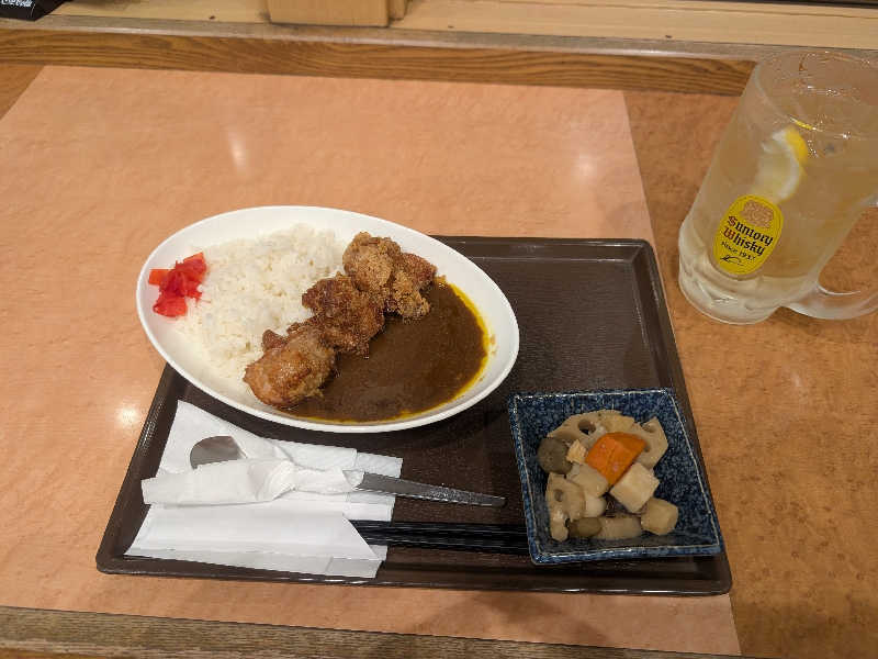 飯は中の食堂で。唐揚げ食べたいけどどうしようか悩んで唐揚げカレーへ。ルーは割とプレーンな感じだけど食べてるとなかなかに満足感あった。筑前煮は前美味しかったから単品でつけたけどカレーに合わせるものではないな。