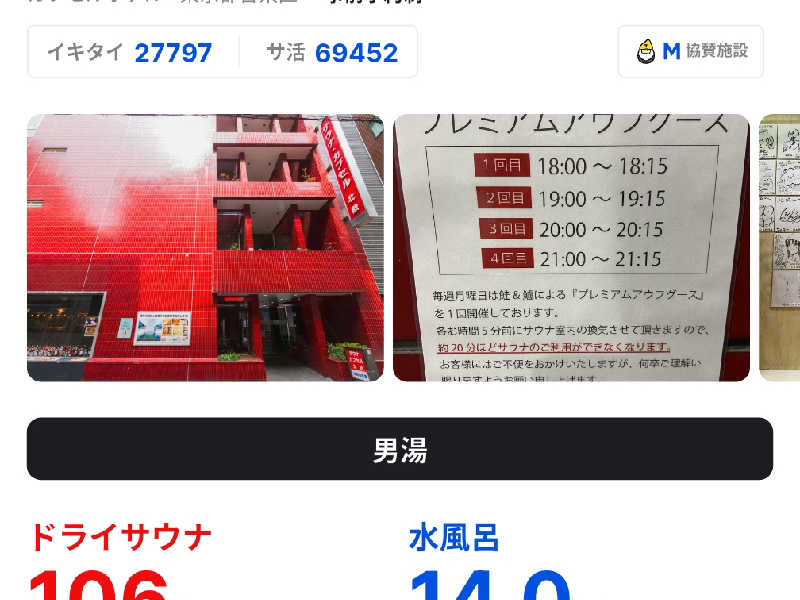 建物がファミレスの居抜き感すごいけどいいサウナだった。三店舗の中ではここが一番近いかな?とはいえなかなか来る機会がないけどまた来たいと思えるサウナでした。浴室内ところどころ段差でか目なのでうっかり踏み外したり転ばないようには注意。