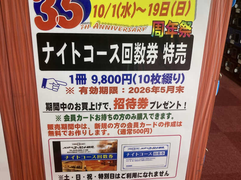 いつもはオレンジ色にゆの文字が光っているのに今日は暗かったからおふろの国は休みなのだろう。19時過ぎにユー鶴到着。10月中は35周年記念で1000円入館クーポンが発行されているが、17時以降はナイト割で1000円なので結果的には同じ1000円で入館できる。