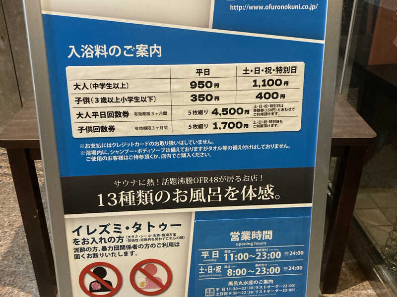 平日3時間コースが2350円で5時間コースが2750円。平日はいいとしても土休日料金は5時間コースのみで3450円というスカイスパよりも高いなかなかの強気設定。土休日のゆいるが2時間で入湯税込2630円であることを考えると貧乏人な私は平日しか来れそうにない。