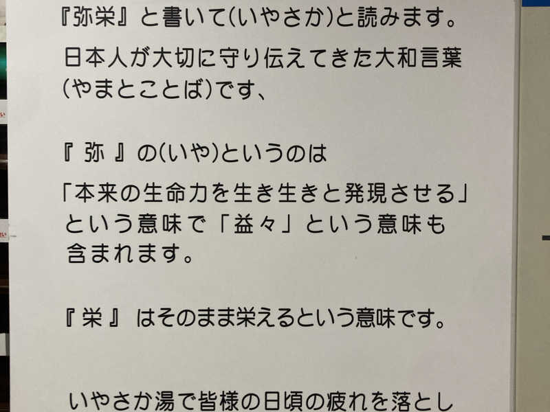 「いやさか」ってどんな意味なんだっけ?いやさか湯に来ると毎回思うのだが、今日は説明書をしっかり読んでみた。弥栄と書いて「益々栄える」と言う意味らしい。なるほど。