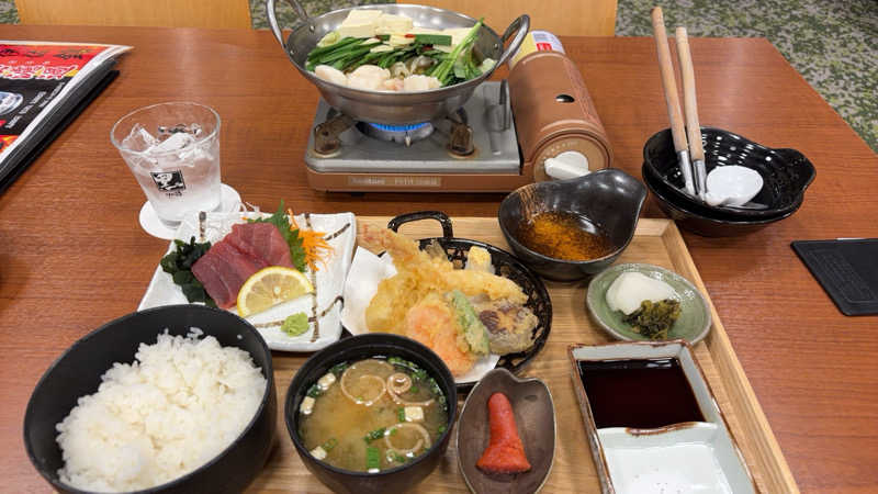 今日はそれよりも たまに開催される 限定のキャビナス御膳 ✨ もつ鍋、刺身、天ぷら、明太子まで付いて980円