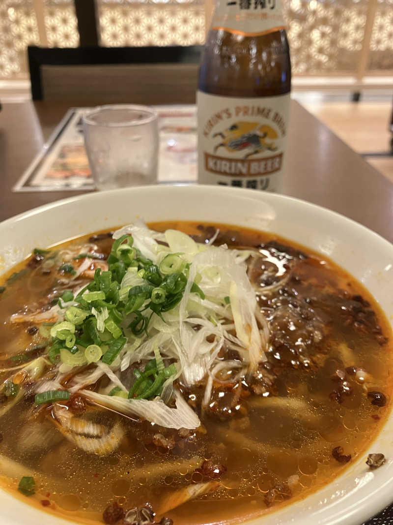 とりあえず館内着着て、屋上9Fの展望足湯庭園でまったり。で、6Fのお食事処へ。花麻椒辣麺とビール🍺 辛ーウマー😊ふぅー