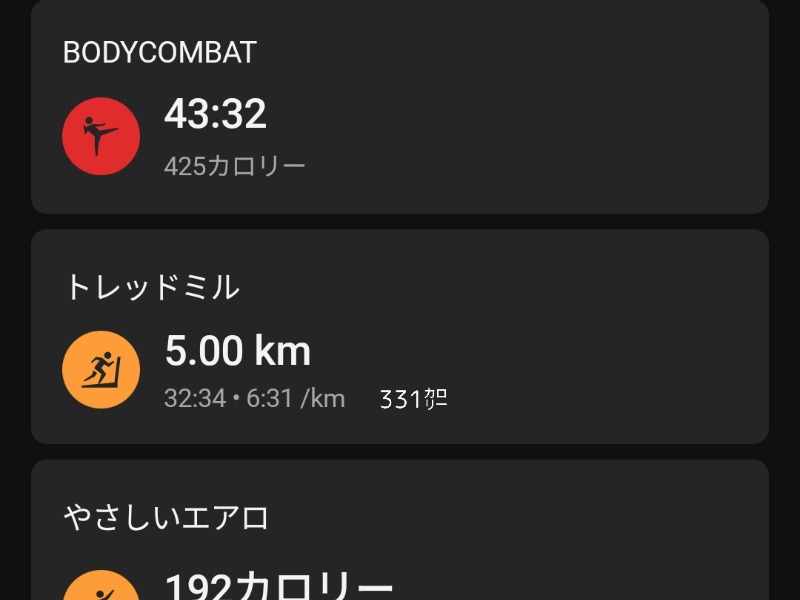 午前中から昼にかけて、やさしいエアロとトレッドミル5kmとBODYCOMBATで動きまくり。