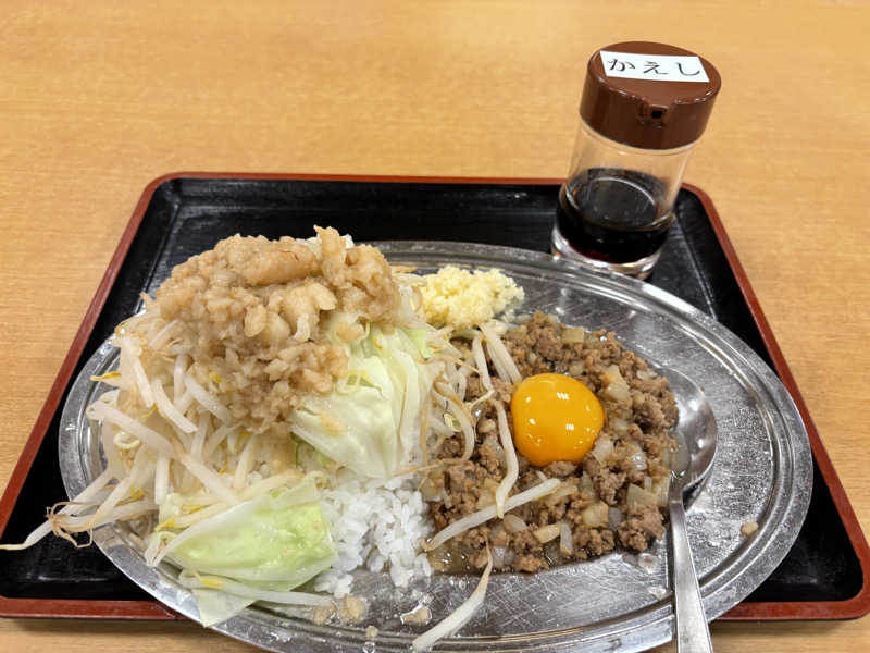 先に、前回食べ損ねたラッコ飯(背脂野菜マシ)を食べてから浴室へ。相変わらずの高温サウナは、直射日光で温められた身体では長くいられませんでした。最初のセットなんか、外気浴中に汗かいてるんですもんw それでも回数繰り返すうちにいい感じにととのってきました。