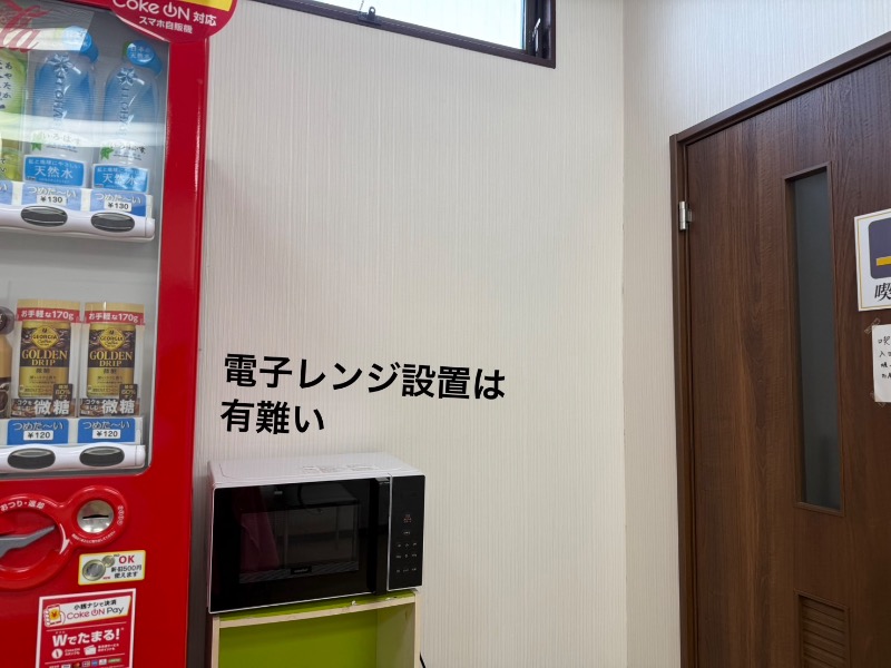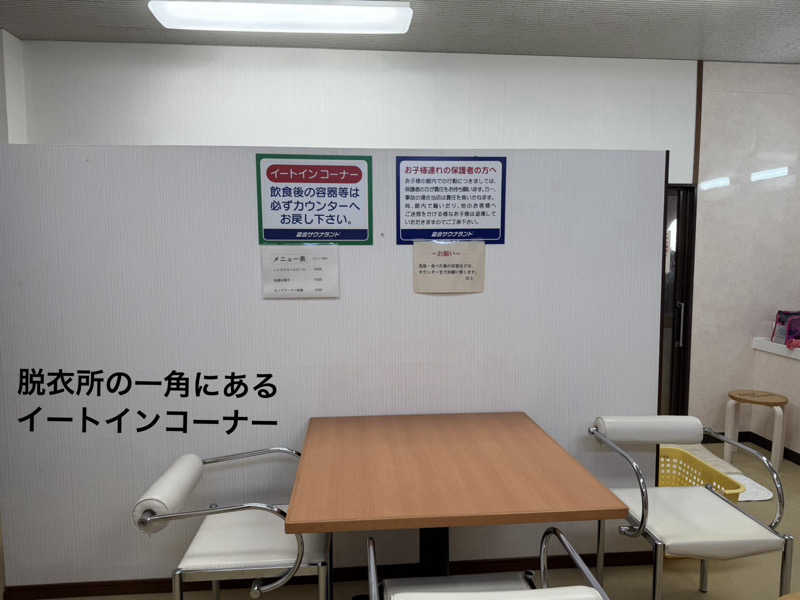 脱衣所はちょっとカオス、左手にはアウターも掛けれる様な背の高いロッカーがNo.12まで並び、右手にはテーブルと三脚の椅子、自販機に電子レンジ…見ればイートインスペースと書いてある