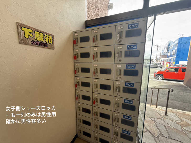 その左側が男湯、右が女湯…ノーコインのシューズロッカーはそれぞれの入口前