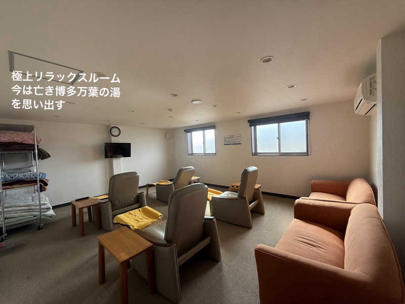 部屋の奥には"リラックスルーム"と書かれたドアが…開くとそこはテレビに、フットレスト付フカフカ.リクライニングチェアー4脚、スタバにありそうなソファも2脚!空調も自由に調節できる、非常に快適な空間が!!棚にはマットレスと掛け布団も置いてあり、ここで仮眠も取れる仕様
